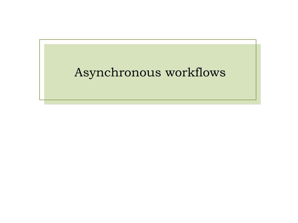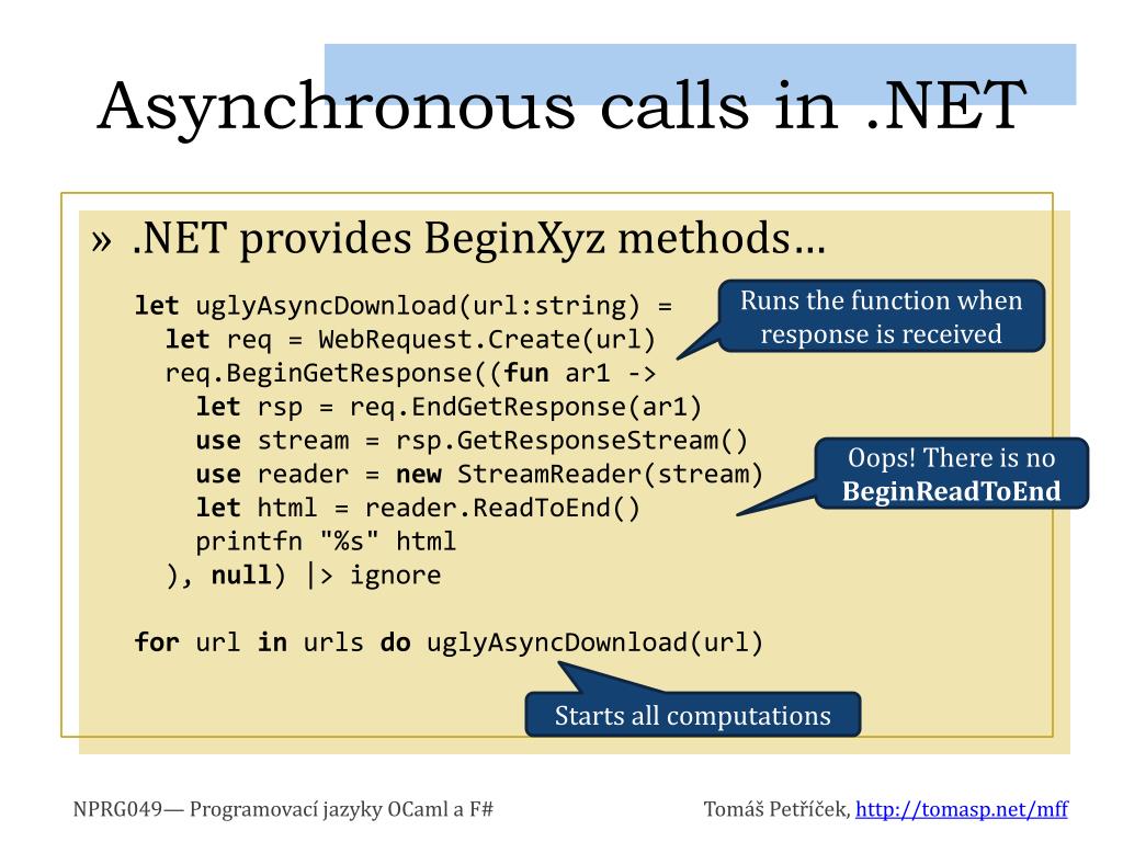 Asynchronous calls in .NET • .NET provides BeginXyz methods… Runs the function when response is received letuglyAsyncDownload(url:string) = letreq = WebRequest.Create(url) req.BeginGetResponse((fun ar1 -> letrsp = req.EndGetResponse(ar1) use stream = rsp.GetResponseStream() use reader = newStreamReader(stream) let html = reader.ReadToEnd() printfn "%s" html ), null) |> ignore forurlinurlsdouglyAsyncDownload(url) Oops! There is no BeginReadToEnd Starts all computations