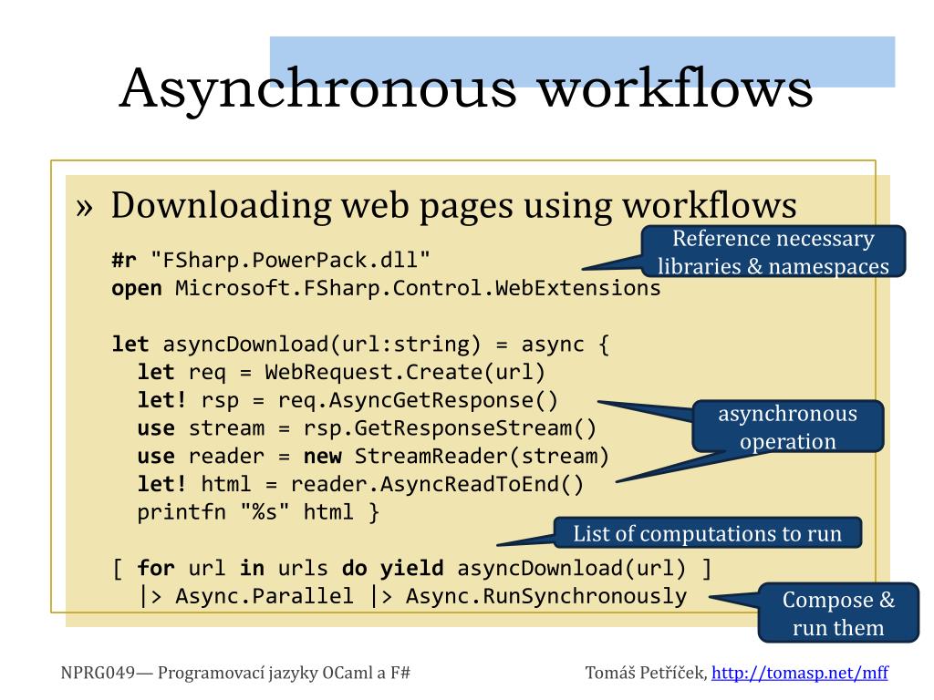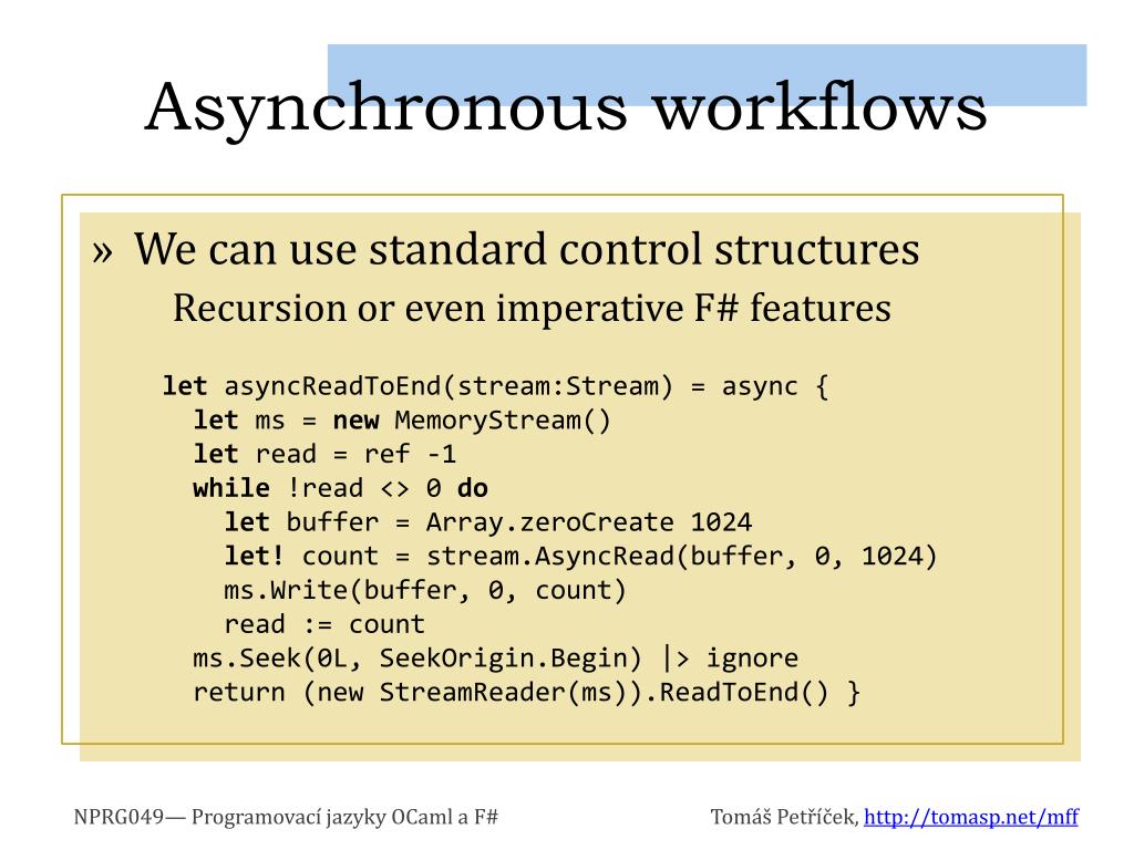Asynchronous workflows • We can use standard control structures Recursion or even imperative F# features let asyncReadToEnd(stream:Stream) = async { let ms = new MemoryStream() let read = ref -1 while !read <> 0 do let buffer = Array.zeroCreate 1024 let! count = stream.AsyncRead(buffer, 0, 1024) ms.Write(buffer, 0, count) read := count ms.Seek(0L, SeekOrigin.Begin) |> ignore return (new StreamReader(ms)).ReadToEnd() }