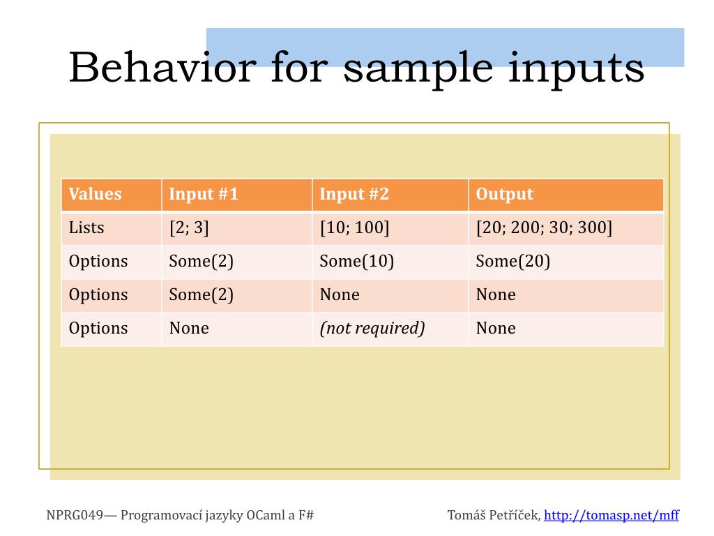 Implementing builder • Simple object type with two members: More about objects in the next lecture :-) • Members should have the usual types: typeOptionBuilder() = memberx.Bind(v, f) = v |> Option.bind f memberx.Return(v) = Some(v) let option = newOptionBuilder() Bind : ('a -> M<'b>) -> M<'a> -> M<'b> Return : 'a -> M<'a>