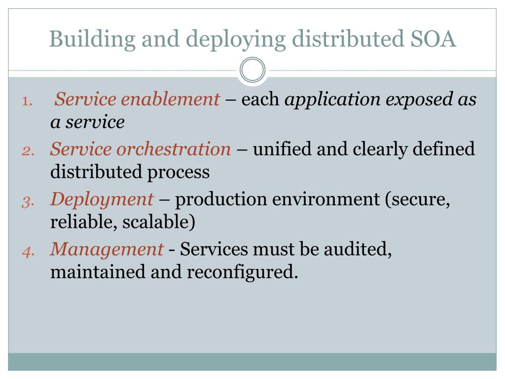 Building and deploying distributed SOA • Service enablement – each application exposed as a service • Service orchestration – unified and clearly defined distributed process • Deployment – production environment (secure, reliable, scalable) • Management - Services must be audited, maintained and reconfigured.