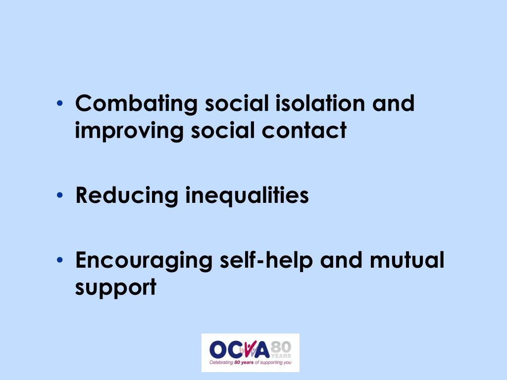 Combating social isolation and improving social contact Reducing inequalities Encouraging self-help and mutual support