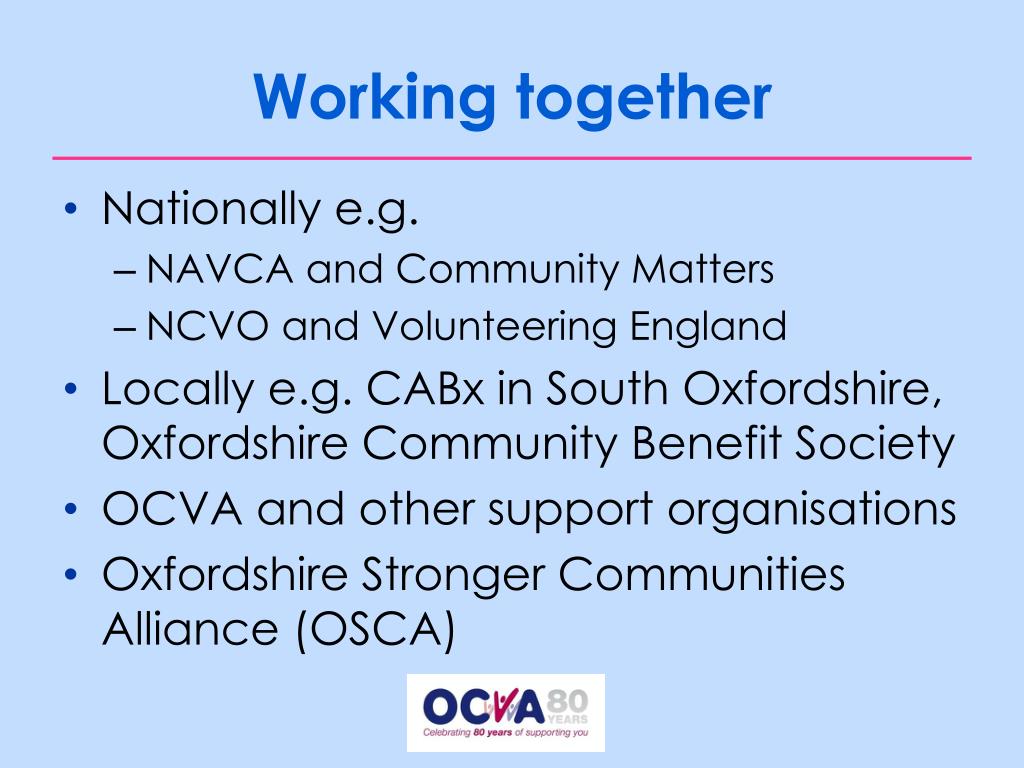 Working together • Nationally e.g. • NAVCA and Community Matters • NCVO and Volunteering England • Locally e.g. CABx in South Oxfordshire, Oxfordshire Community Benefit Society • OCVA and other support organisations • Oxfordshire Stronger Communities Alliance (OSCA)