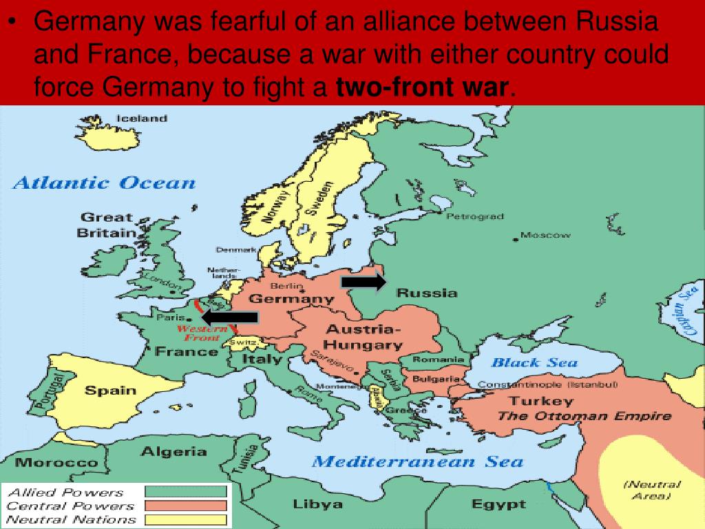 Germany was fearful of an alliance between Russia and France, because a war with either country could force Germany to fight a two-front war.