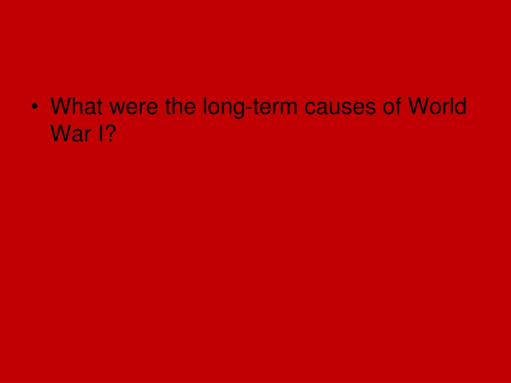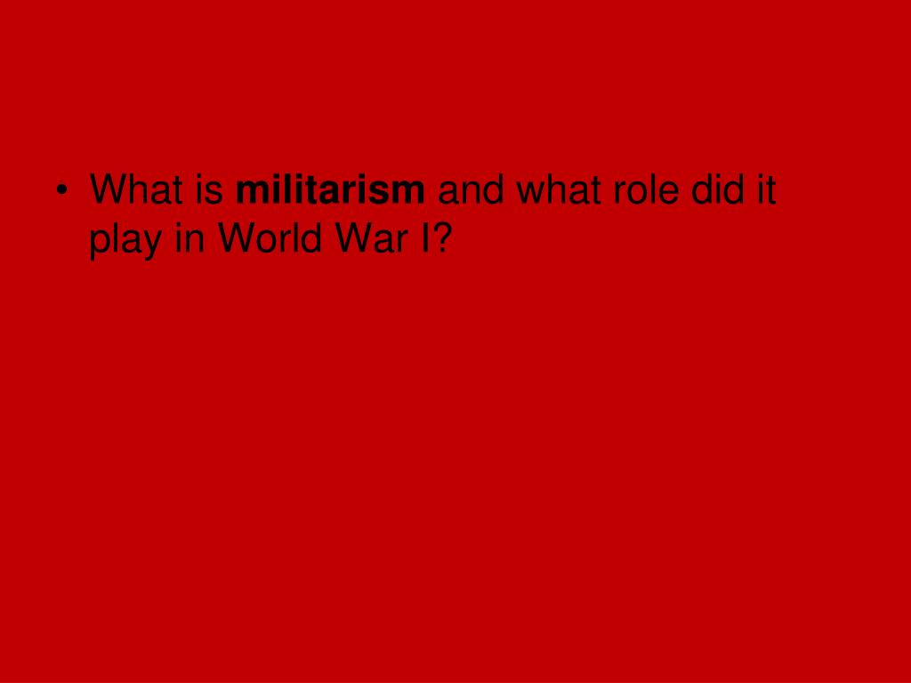 World War I The Great War. What were the long-term causes of World War I?. M ilitarism A lliance System I mperialism N ationalism. What is militarism and what role did it play in World War I?.