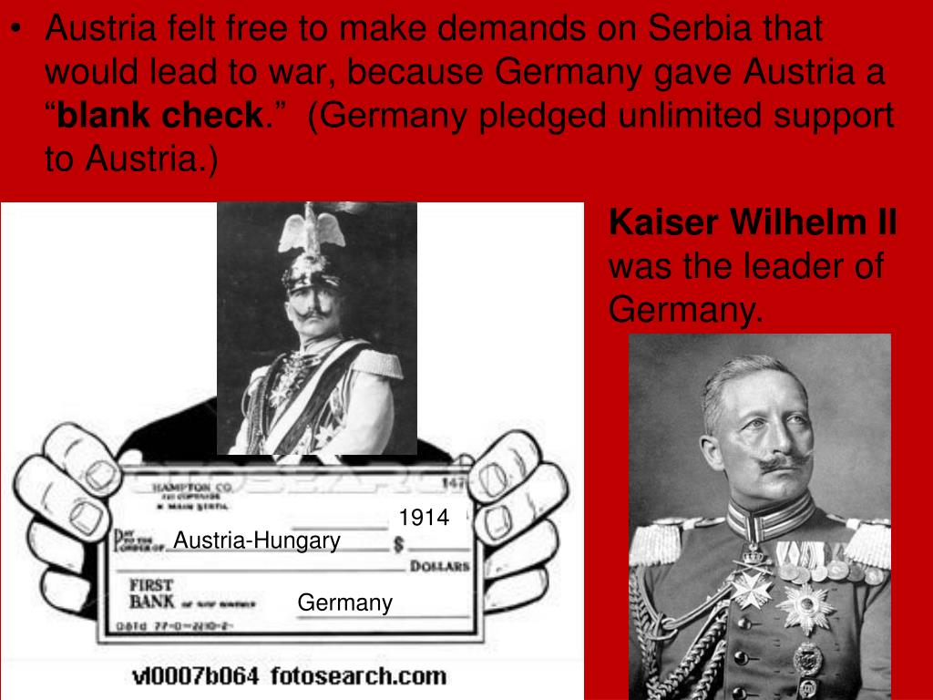 Austria felt free to make demands on Serbia that would lead to war, because Germany gave Austria a “blank check.” (Germany pledged unlimited support to Austria.) Kaiser Wilhelm II was the leader of Germany. 1914 Austria-Hungary Germany