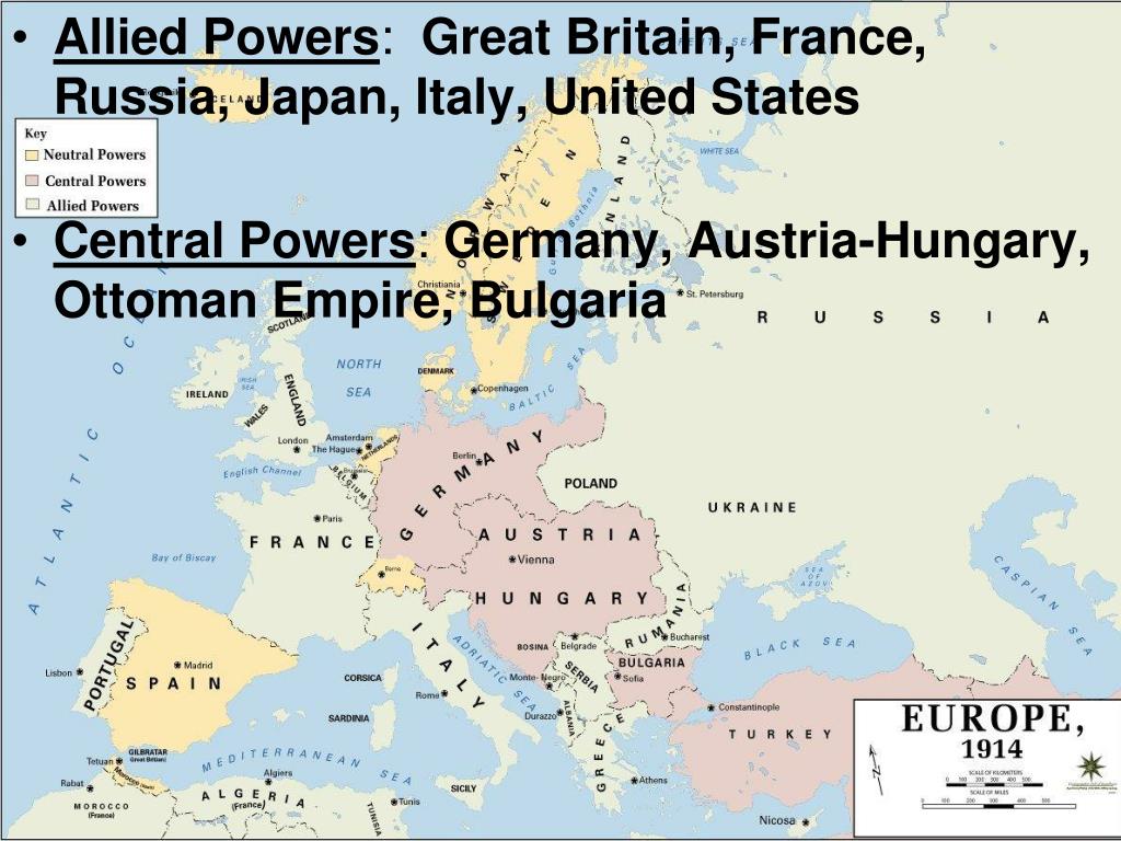 Allied Powers: Great Britain, France, Russia, Japan, Italy, United States • Central Powers: Germany, Austria-Hungary, Ottoman Empire, Bulgaria