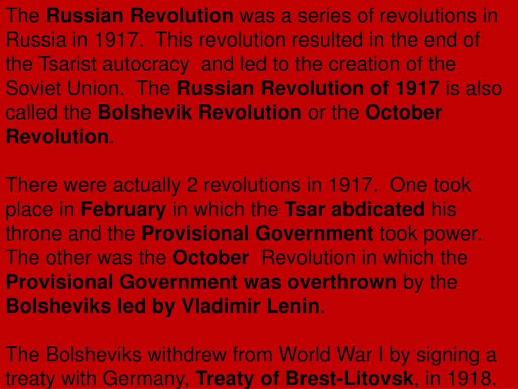 The Russian Revolution was a series of revolutions in Russia in 1917. This revolution resulted in the end of the Tsarist autocracy and led to the creation of the Soviet Union. The Russian Revolution of 1917 is also called the Bolshevik Revolution or the October Revolution. There were actually 2 revolutions in 1917. One took place in February in which the Tsar abdicated his throne and the Provisional Government took power. The other was the October Revolution in which the Provisional Government was overthrown by the Bolsheviks led by Vladimir Lenin. The Bolsheviks withdrew from World War I by signing a treaty with Germany, Treaty of Brest-Litovsk, in 1918.