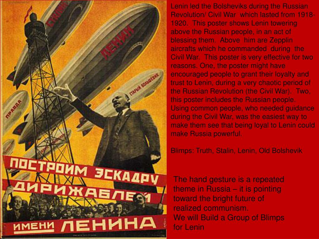 Lenin led the Bolsheviks during the Russian Revolution/ Civil War which lasted from 1918-1920. This poster shows Lenin towering above the Russian people, in an act of blessing them. Above him are Zepplin aircrafts which he commanded during the Civil War. This poster is very effective for two reasons. One, the poster might have encouraged people to grant their loyalty and trust to Lenin, during a very chaotic period of the Russian Revolution (the Civil War). Two, this poster includes the Russian people. Using common people, who needed guidance during the Civil War, was the easiest way to make them see that being loyal to Lenin could make Russia powerful. Blimps: Truth, Stalin, Lenin, Old Bolshevik The hand gesture is a repeated theme in Russia – it is pointing toward the bright future of realized communism. We will Build a Group of Blimps for Lenin