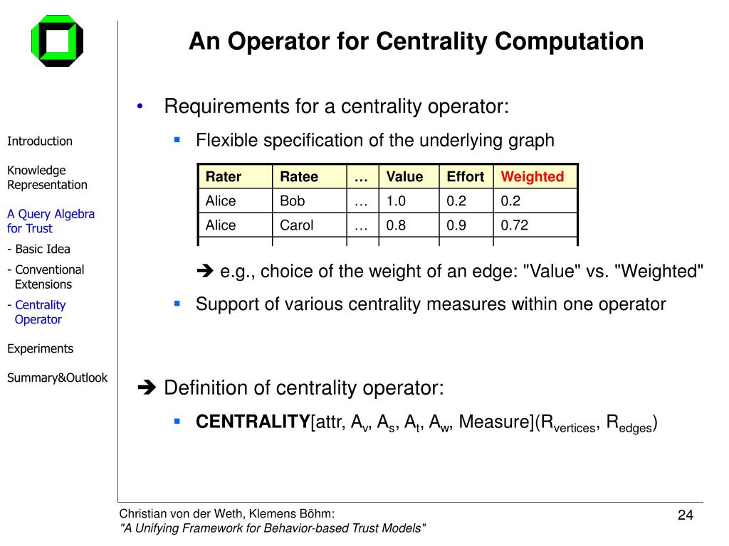 Approach to an Algebra-based Policy Language • Source: Relational representation of knowledge • Evaluation of a trust policy = Query on the knowledge base • Common way to deal with relations: Relational Algebra (RA) • Set of operators for the application on relations • Closure property of the operators allows for nesting of the operators to more complex algebra expressions Basic Idea: Relational Algebra (RA) as basis for our trust policy language Introduction Knowledge Representation A Query Algebra for Trust • Basic Idea • Conventional Extensions • Centrality Operator Experiments Summary&Outlook Christian von der Weth, Klemens Böhm: "A Unifying Framework for Behavior-based Trust Models"