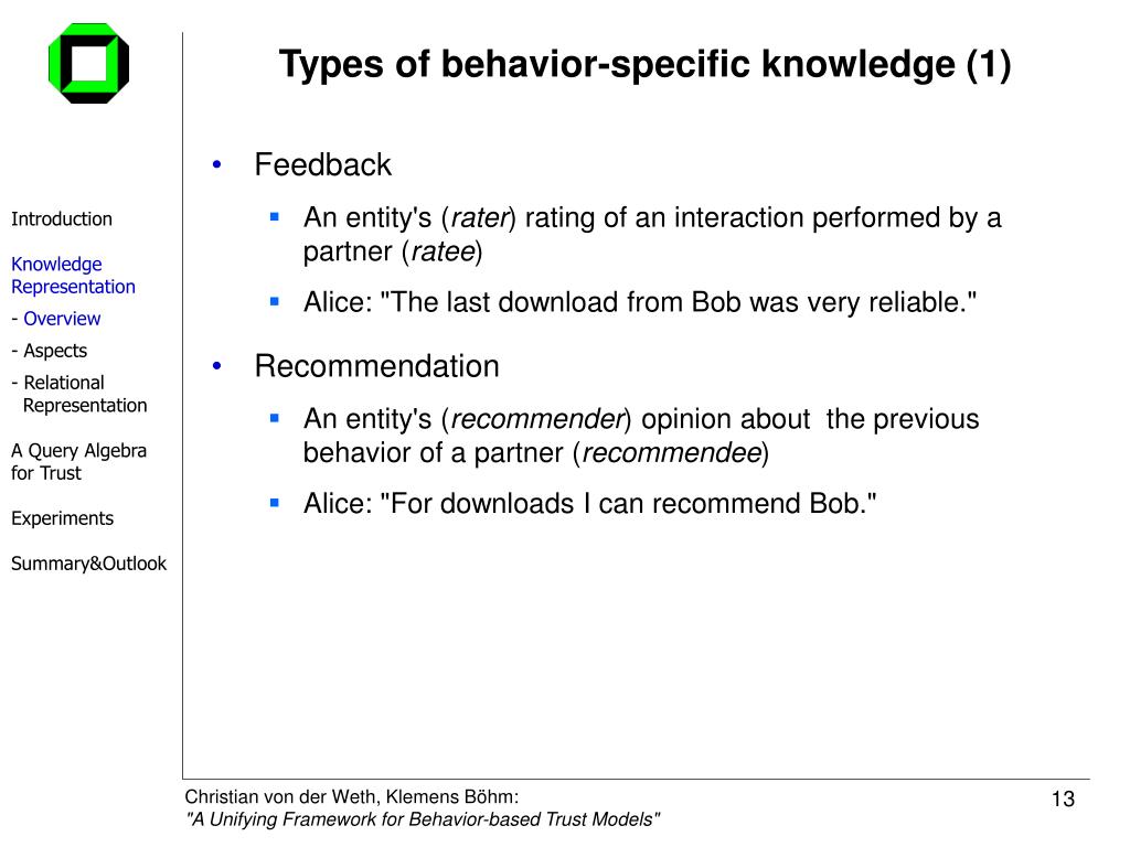 Types of behavior-specific knowledge (1) • Feedback • An entity's (rater) rating of an interaction performed by a partner (ratee) • Alice: "The last download from Bob was very reliable." • Recommendation • An entity's (recommender) opinion about the previous behavior of a partner (recommendee) • Alice: "For downloads I can recommend Bob." Introduction Knowledge Representation • Overview • Aspects • Relational Representation A Query Algebra for Trust Experiments Summary&Outlook Christian von der Weth, Klemens Böhm: "A Unifying Framework for Behavior-based Trust Models"