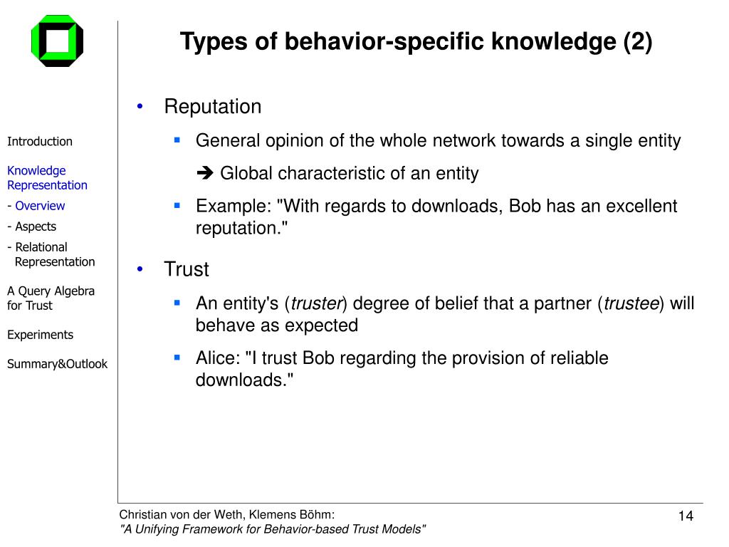 Types of behavior-specific knowledge (2) • Reputation • General opinion of the whole network towards a single entity Global characteristic of an entity • Example: "With regards to downloads, Bob has an excellent reputation." • Trust • An entity's (truster) degree of belief that a partner (trustee) will behave as expected • Alice: "I trust Bob regarding the provision of reliable downloads." Introduction Knowledge Representation • Overview • Aspects • Relational Representation A Query Algebra for Trust Experiments Summary&Outlook Christian von der Weth, Klemens Böhm: "A Unifying Framework for Behavior-based Trust Models"