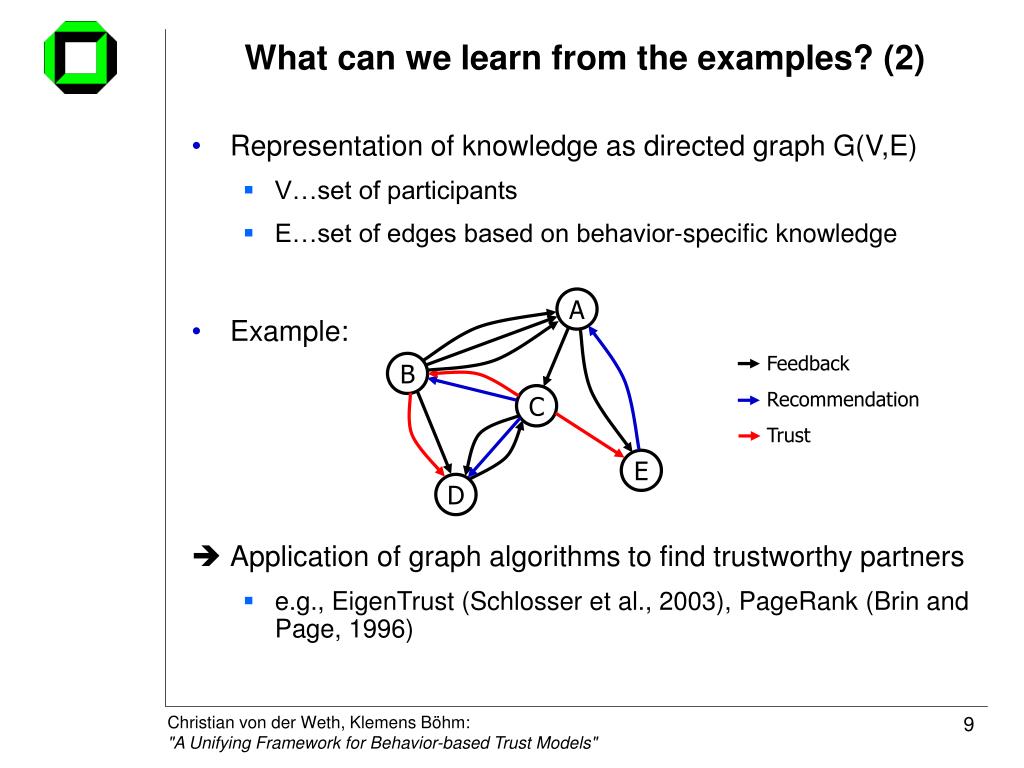 What can we learn from the examples? (2) • Representation of knowledge as directed graph G(V,E) • V…set of participants • E…set of edges based on behavior-specific knowledge • Example: Application of graph algorithms to find trustworthy partners • e.g., EigenTrust (Schlosser et al., 2003), PageRank (Brin and Page, 1996) A Feedback Recommendation Trust B C E D Christian von der Weth, Klemens Böhm: "A Unifying Framework for Behavior-based Trust Models"