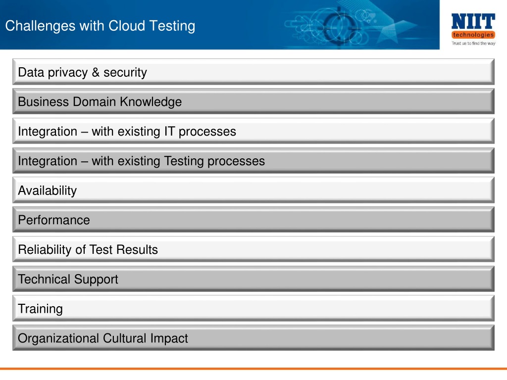 Challenges with Cloud Testing Data privacy & security Business Domain Knowledge Integration – with existing IT processes Integration – with existing Testing processes Availability Performance Reliability of Test Results Technical Support Training Organizational Cultural Impact