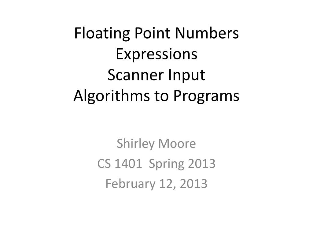 Floating Point NumbersExpressionsScanner InputAlgorithms to Programs Shirley Moore CS 1401 Spring 2013 February 12, 2013