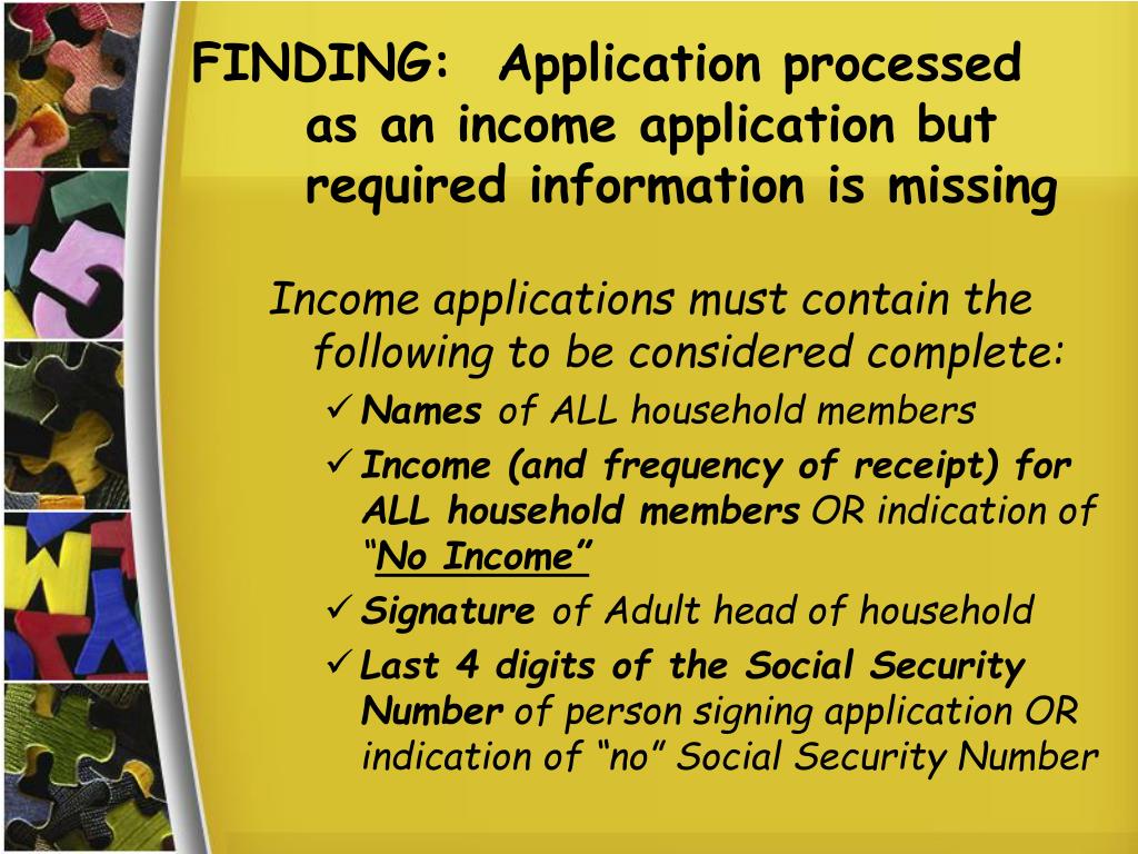 FINDING: Application processed as an income application but required information is missing Income applications must contain the following to be considered complete: • Names of ALL household members • Income (and frequency of receipt) for ALL household members OR indication of “No Income” • Signature of Adult head of household • Last 4 digits of the Social Security Number of person signing application OR indication of “no” Social Security Number
