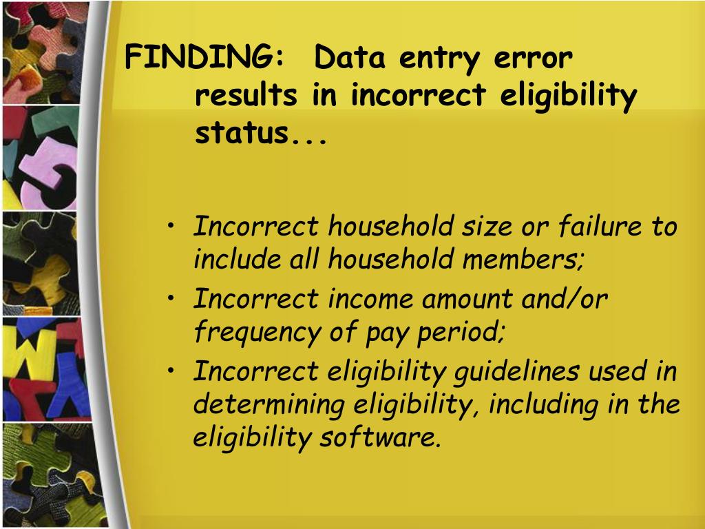 FINDING: Data entry error results in incorrect eligibility status... • Incorrect household size or failure to include all household members; • Incorrect income amount and/or frequency of pay period; • Incorrect eligibility guidelines used in determining eligibility, including in the eligibility software.