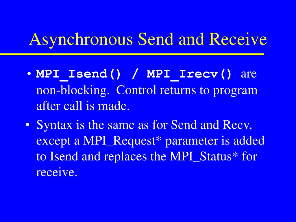Asynchronous Send and Receive • MPI_Isend() / MPI_Irecv() are non-blocking. Control returns to program after call is made. • Syntax is the same as for Send and Recv, except a MPI_Request* parameter is added to Isend and replaces the MPI_Status* for receive.