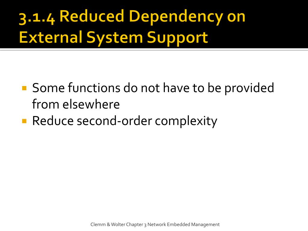 3.1.4 Reduced Dependency on External System Support • Some functions do not have to be provided from elsewhere • Reduce second-order complexity Clemm & Wolter Chapter 3 Network Embedded Management