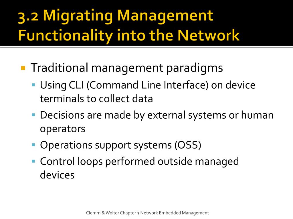3.2 Migrating Management Functionality into the Network • Traditional management paradigms • Using CLI (Command Line Interface) on device terminals to collect data • Decisions are made by external systems or human operators • Operations support systems (OSS) • Control loops performed outside managed devices Clemm & Wolter Chapter 3 Network Embedded Management