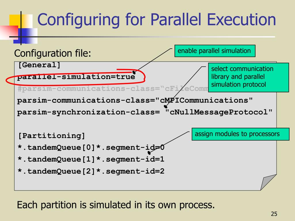 Configuring for Parallel Execution enable parallel simulation Configuration file: [General] parallel-simulation=true #parsim-communications-class=“cFileCommunications" parsim-communications-class="cMPICommunications" parsim-synchronization-class= "cNullMessageProtocol" [Partitioning] *.tandemQueue[0]*.segment-id=0 *.tandemQueue[1]*.segment-id=1 *.tandemQueue[2]*.segment-id=2 select communication library and parallel simulation protocol assign modules to processors Each partition is simulated in its own process.