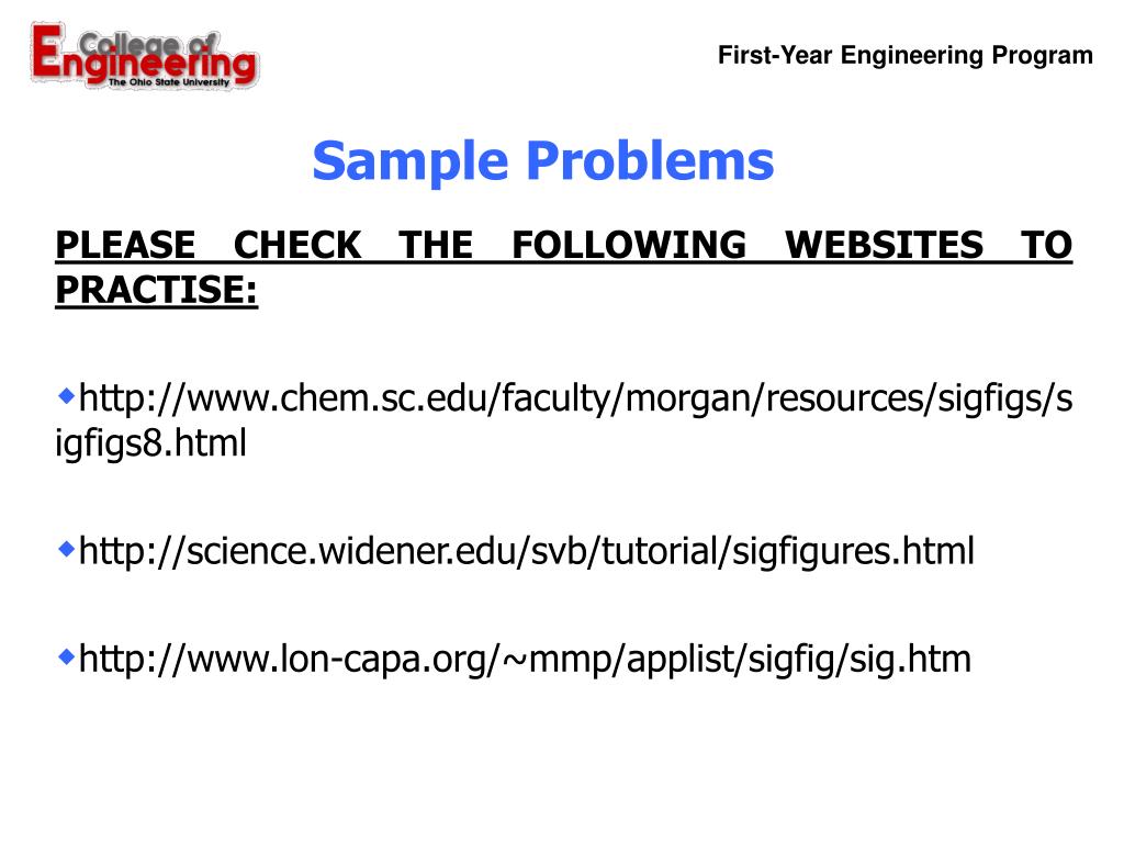 Sample Problems PLEASE CHECK THE FOLLOWING WEBSITES TO PRACTISE: • http://www.chem.sc.edu/faculty/morgan/resources/sigfigs/sigfigs8.html • http://science.widener.edu/svb/tutorial/sigfigures.html • http://www.lon-capa.org/~mmp/applist/sigfig/sig.htm