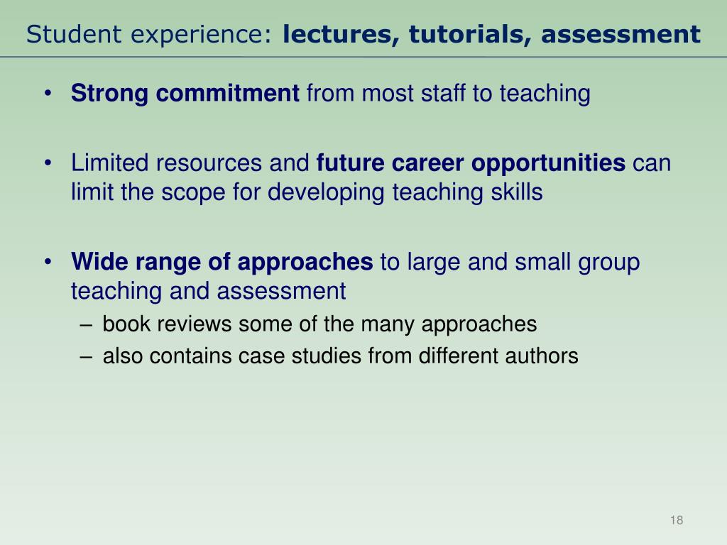 Student experience: lectures, tutorials, assessment • Strong commitment from most staff to teaching • Limited resources and future career opportunities can limit the scope for developing teaching skills • Wide range of approaches to large and small group teaching and assessment • book reviews some of the many approaches • also contains case studies from different authors