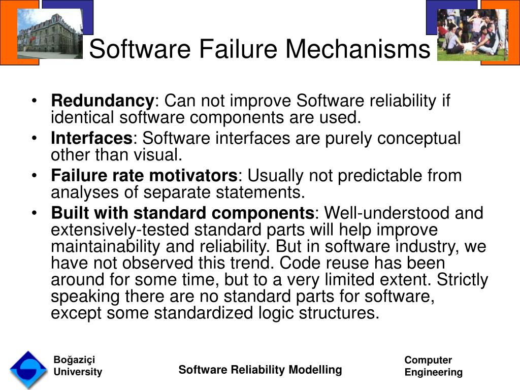 Software Failure Mechanisms • Redundancy: Can not improve Software reliability if identical software components are used. • Interfaces: Software interfaces are purely conceptual other than visual. • Failure rate motivators: Usually not predictable from analyses of separate statements. • Built with standard components: Well-understood and extensively-tested standard parts will help improve maintainability and reliability. But in software industry, we have not observed this trend. Code reuse has been around for some time, but to a very limited extent. Strictly speaking there are no standard parts for software, except some standardized logic structures.