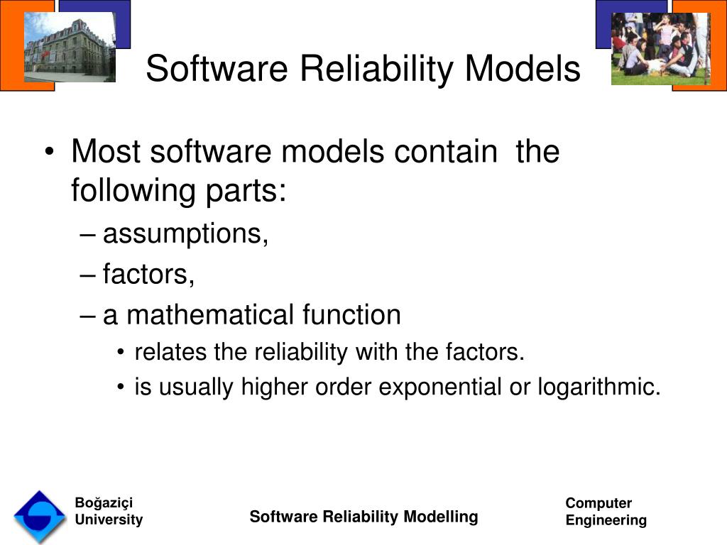 Software Reliability Models • Most software models contain the following parts: • assumptions, • factors, • a mathematical function • relates the reliability with the factors. • is usually higher order exponential or logarithmic.