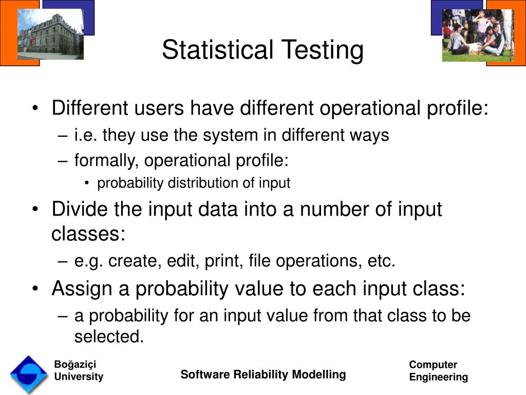 Statistical Testing • Different users have different operational profile: • i.e. they use the system in different ways • formally, operational profile: • probability distribution of input • Divide the input data into a number of input classes: • e.g. create, edit, print, file operations, etc. • Assign a probability value to each input class: • a probability for an input value from that class to be selected.