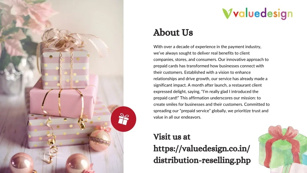 About Us With over a decade of experience in the payment industry, we’ve always sought to deliver real benefits to client companies, stores, and consumers. Our innovative approach to prepaid cards has transformed how businesses connect with their customers. Established with a vision to enhance relationships and drive growth, our service has already made a significant impact. A month after launch, a restaurant client expressed delight, saying, “I’m really glad I introduced the prepaid card!” This affirmation underscores our mission: to create smiles for businesses and their customers. Committed to spreading our “prepaid service” globally, we prioritize trust and value in all our endeavors. Visit us at https://valuedesign.co.in/distribution-reselling.php
