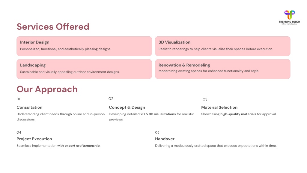 About Trending Touch Trending Touch is a premier interior design firm based in Hyderabad, India, known for crafting sophisticated and personalized interiors that blend aesthetics with functionality. Founded by Pooja Nalamothu, the company specializes in residential, commercial, and landscaping solutions, delivering unique designs tailored to clients' needs. With decade+ years of industry experience, 250+ completed projects, and over 1.2 million square feet of designed spaces, Trending Touch has established itself as a trusted name in the interior design industry. Vision & Mission Vision: To create stunning, functional, and timeless interior spaces that enhance lifestyles and leave a lasting impact. Mission: To deliver client-centric, innovative, and sustainable interior design solutions while maintaining high- quality craftsmanship and attention to detail.