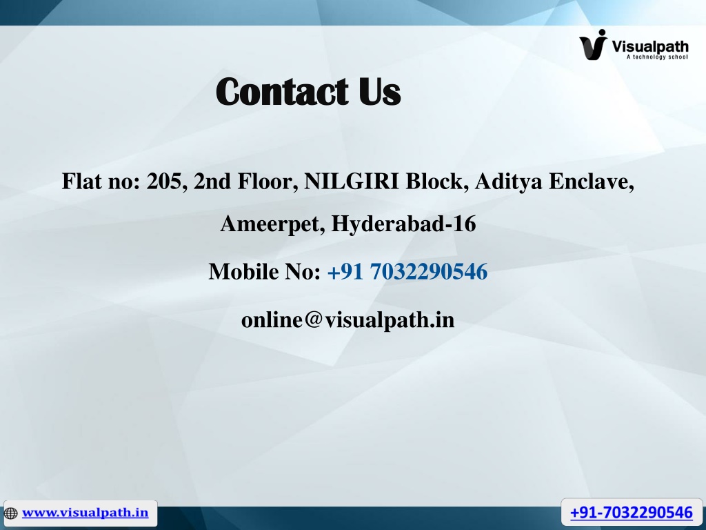 ContactUs Flat no: 205, 2nd Floor, NILGIRI Block, Aditya Enclave, Ameerpet, Hyderabad-16 Mobile No: +91 7032290546 online@visualpath.in