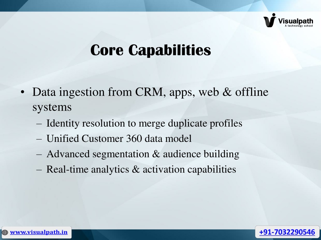 Core Capabilities • Data ingestion from CRM, apps, web & offline systems • Identity resolution to merge duplicate profiles • Unified Customer 360 data model • Advanced segmentation & audience building • Real-time analytics & activation capabilities