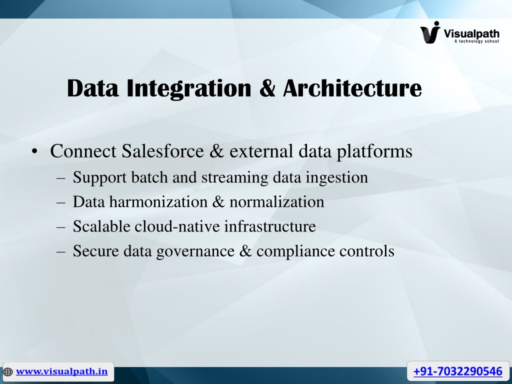 Data Integration & Architecture • Connect Salesforce & external data platforms • Support batch and streaming data ingestion • Data harmonization & normalization • Scalable cloud-native infrastructure • Secure data governance & compliance controls