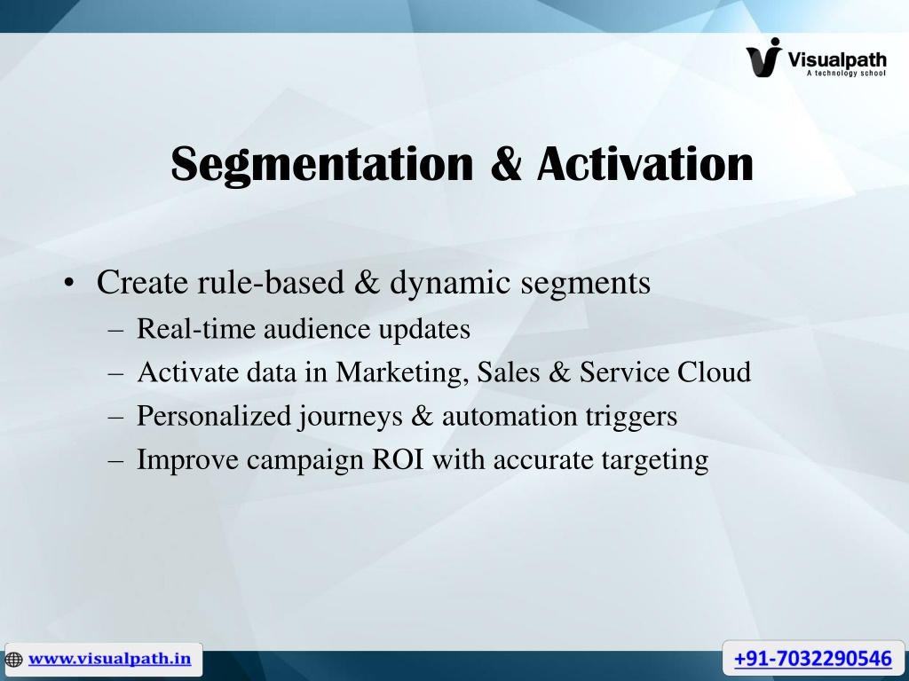 Segmentation & Activation • Create rule-based & dynamic segments • Real-time audience updates • Activate data in Marketing, Sales & Service Cloud • Personalized journeys & automation triggers • Improve campaign ROI with accurate targeting