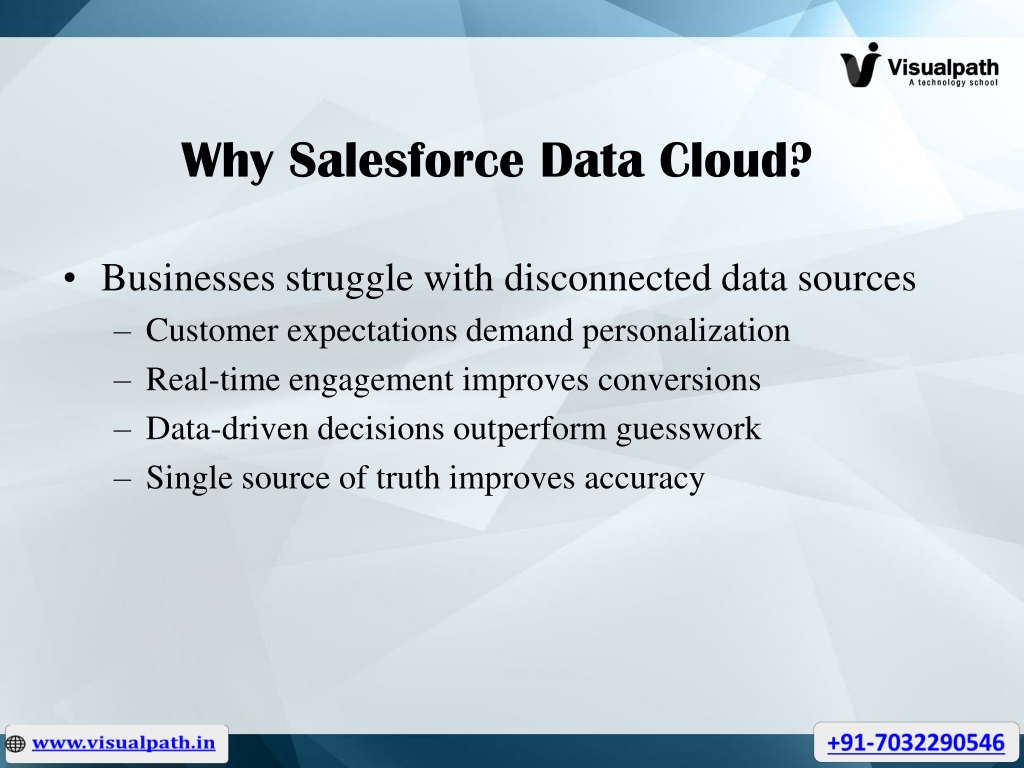 Salesforce Data Cloud Training in Bangalore at Visualpath helps you master real-time data ingestion, Customer 360 profiles, and AI-driven insights. Our Salesforce Data Cloud Online Training offers hands-on projects and practical skills to boost your Salesforce career and become job-ready. Book your free demo today. Call 91-7032290546<br>Website:https://www.visualpath.in/salesforce-data-cloud-training.html <br>WhatsApp: https://wa.me/c/917032290546<br>Visit Blog: https://visualpathblogs.com/category/salesforce-data-cloud/