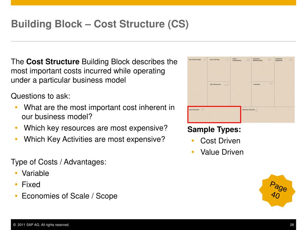 Building Block – Cost Structure (CS) • The Cost Structure Building Block describes the most important costs incurred while operating under a particular business model • Questions to ask: • What are the most important cost inherent in our business model? • Which key resources are most expensive? • Which Key Activities are most expensive? • Type of Costs / Advantages: • Variable • Fixed • Economies of Scale / Scope Sample Types: • Cost Driven • Value Driven Page40