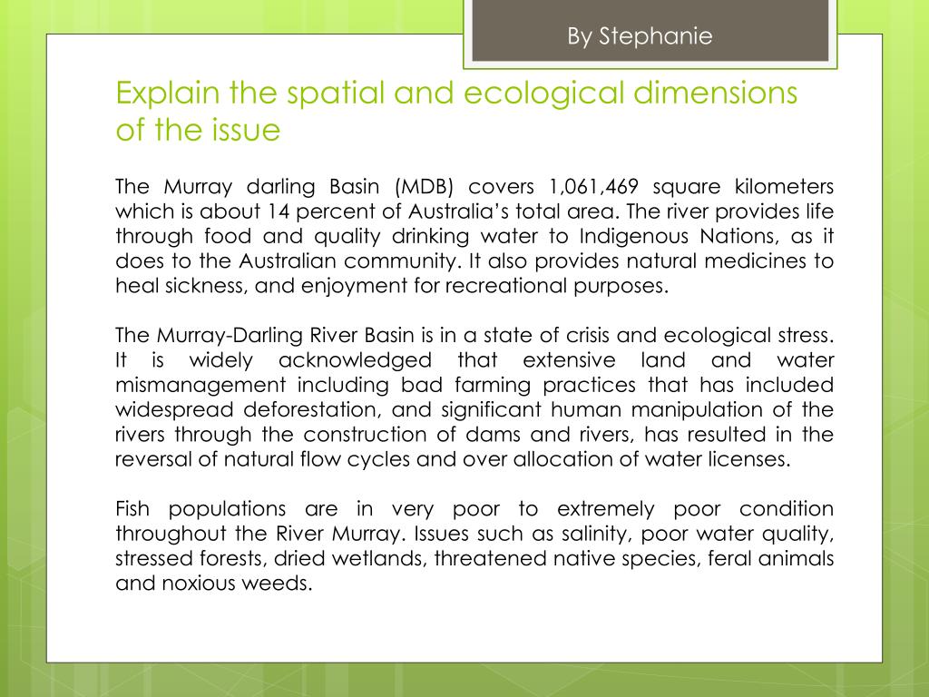 By Stephanie Explain the spatial and ecological dimensions of the issue The Murray darling Basin (MDB) covers 1,061,469 square kilometers which is about 14 percent of Australia’s total area. The river provides life through food and quality drinking water to Indigenous Nations, as it does to the Australian community. It also provides natural medicines to heal sickness, and enjoyment for recreational purposes. The Murray-Darling River Basin is in a state of crisis and ecological stress. It is widely acknowledged that extensive land and water mismanagement including bad farming practices that has included widespread deforestation, and significant human manipulation of the rivers through the construction of dams and rivers, has resulted in the reversal of natural flow cycles and over allocation of water licenses. Fish populations are in very poor to extremely poor condition throughout the River Murray. Issues such as salinity, poor water quality, stressed forests, dried wetlands, threatened native species, feral animals and noxious weeds.