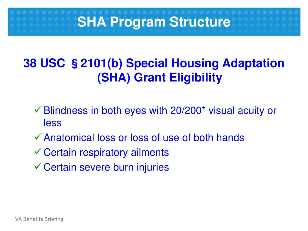 SHA Program Structure 38 USC §2101(b) Special Housing Adaptation (SHA) Grant Eligibility • Blindness in both eyes with 20/200* visual acuity or less • Anatomical loss or loss of use of both hands • Certain respiratory ailments • Certain severe burn injuries