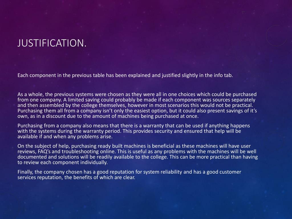 Justification. Each component in the previous table has been explained and justified slightly in the info tab. As a whole, the previous systems were chosen as they were all in one choices which could be purchased from one company. A limited saving could probably be made if each component was sources separately and then assembled by the college themselves, however in most scenarios this would not be practical. Purchasing them all from a company isn’t only the easiest option, but it could also present savings of it’s own, as in a discount due to the amount of machines being purchased at once. Purchasing from a company also means that there is a warranty that can be used if anything happens with the systems during the warranty period. This provides security and ensured that help will be available if and when any problems arise. On the subject of help, purchasing ready built machines is beneficial as these machines will have user reviews, FAQ’s and troubleshooting online. This is useful as any problems with the machines will be well documented and solutions will be readily available to the college. This can be more practical than having to review each component individually. Finally, the company chosen has a good reputation for system reliability and has a good customer services reputation, the benefits of which are clear.