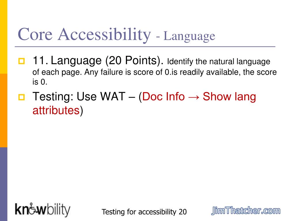 Core Accessibility - Language • 11.Language (20 Points). Identify the natural language of each page. Any failure is score of 0.is readily available, the score is 0. • Testing: Use WAT – (Doc Info → Show lang attributes) Testing for accessibility 20