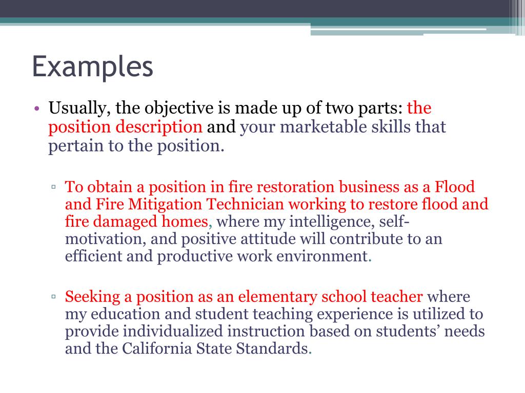 Examples • Usually, the objective is made up of two parts: the position description and your marketable skills that pertain to the position. • To obtain a position in fire restoration business as a Flood and Fire Mitigation Technician working to restore flood and fire damaged homes, where my intelligence, self-motivation, and positive attitude will contribute to an efficient and productive work environment. • Seeking a position as an elementary school teacher where my education and student teaching experience is utilized to provide individualized instruction based on students’ needs and the California State Standards.