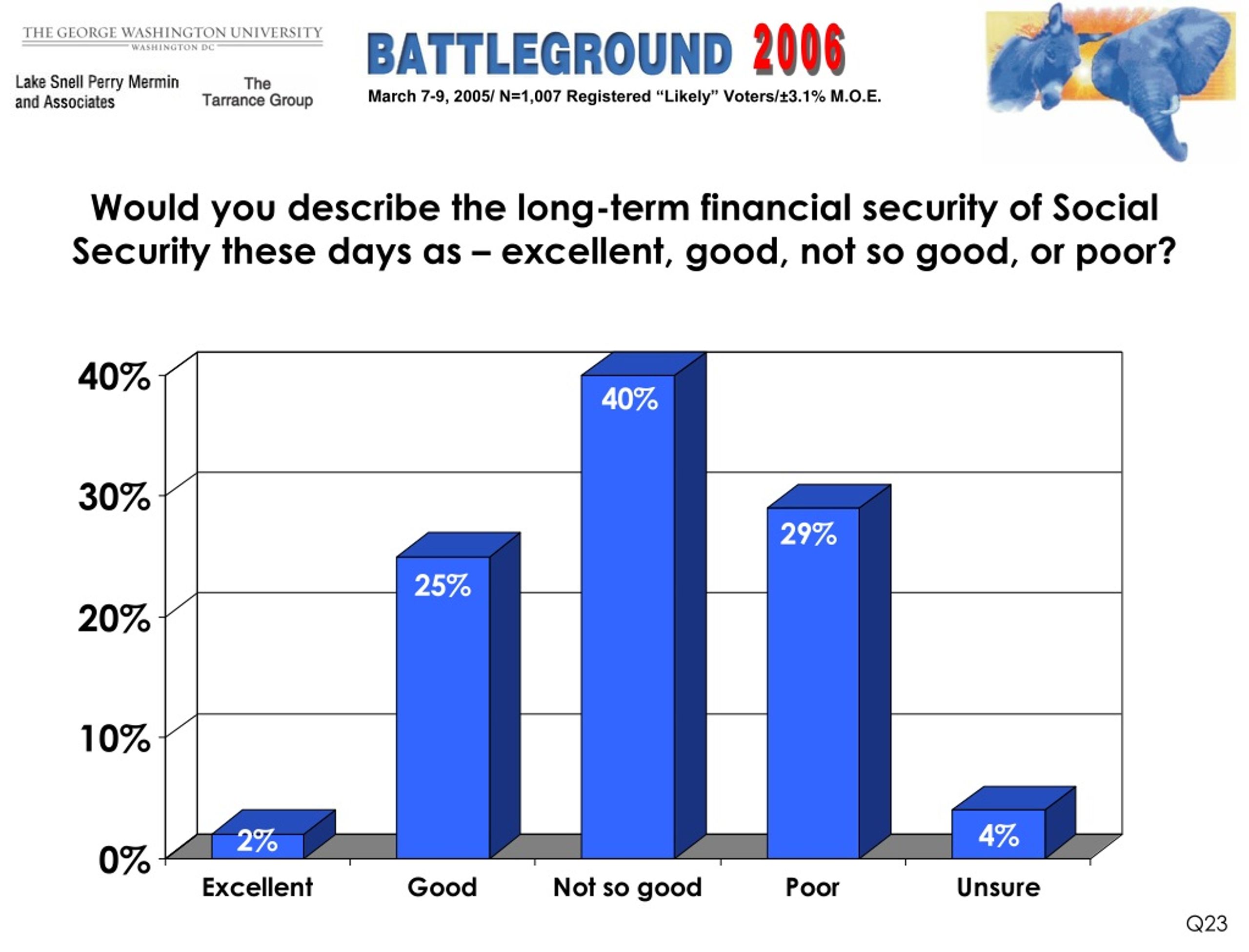 March 7-9, 2005/ N=1,007 Registered “Likely” Voters/±3.1% M.O.E. Would you describe the long-term financial security of Social Security these days as – excellent, good, not so good, or poor? Q23