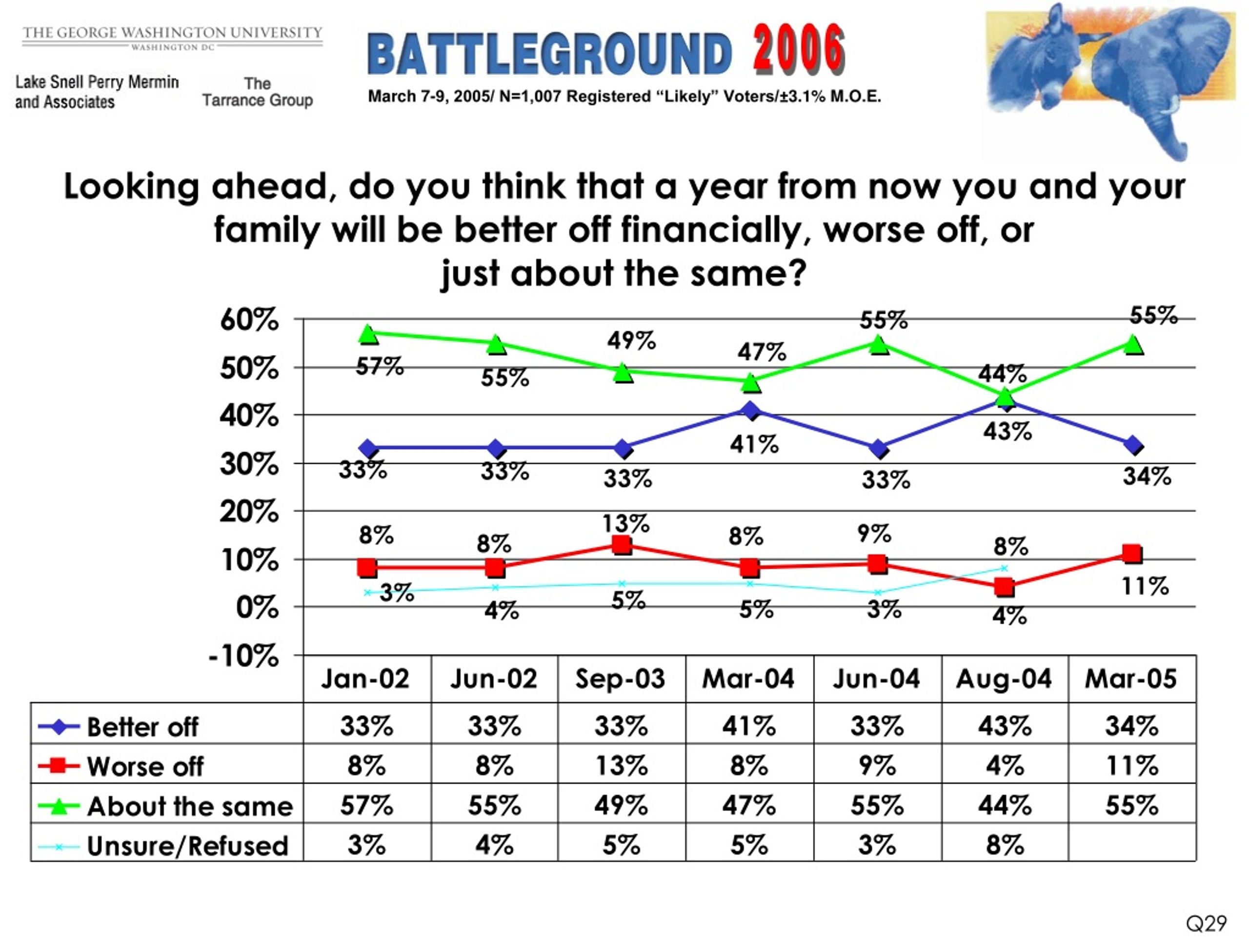 March 7-9, 2005/ N=1,007 Registered “Likely” Voters/±3.1% M.O.E. Looking ahead, do you think that a year from now you and your family will be better off financially, worse off, or just about the same? Q29
