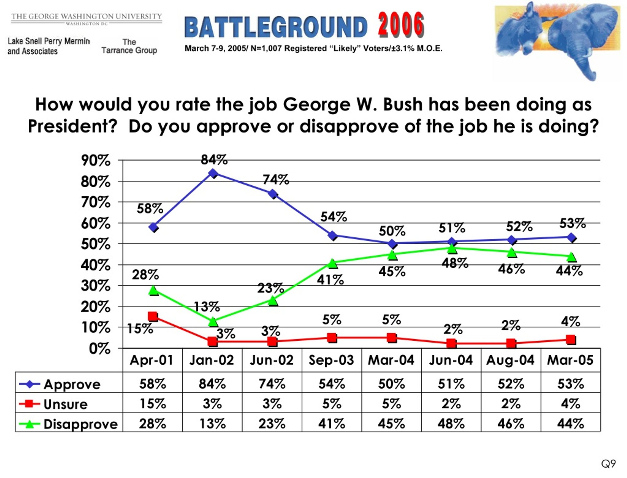 March 7-9, 2005/ N=1,007 Registered “Likely” Voters/±3.1% M.O.E. How would you rate the job George W. Bush has been doing as President? Do you approve or disapprove of the job he is doing? Q9