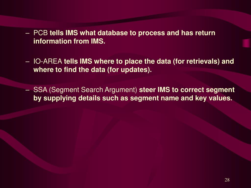 PCB tells IMS what database to process and has return information from IMS. • IO-AREA tells IMS where to place the data (for retrievals) and where to find the data (for updates). • SSA (Segment Search Argument) steer IMS to correct segment by supplying details such as segment name and key values.