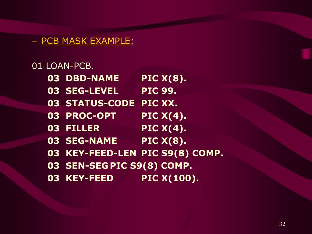 PCB MASK EXAMPLE: 01 LOAN-PCB. 03 DBD-NAME PIC X(8). 03 SEG-LEVEL PIC 99. 03 STATUS-CODE PIC XX. 03 PROC-OPT PIC X(4). 03 FILLER PIC X(4). 03 SEG-NAME PIC X(8). 03 KEY-FEED-LEN PIC S9(8) COMP. 03 SEN-SEG PIC S9(8) COMP. 03 KEY-FEED PIC X(100).
