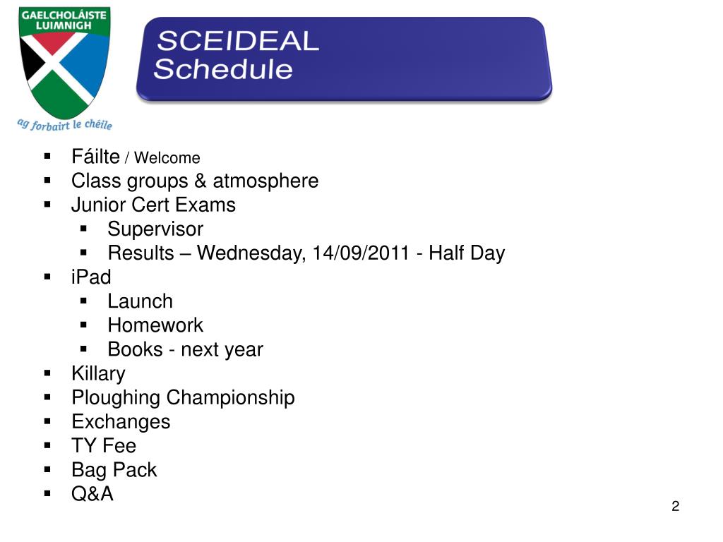 Gaelcholáiste Luimnigh. Oíche Eolais - Idirbhliain TY Information Evening. Parents / Guardians 5 th September 2011. www.gcluimnigh.ie. Fáilte / Welcome Class groups & atmosphere Junior Cert Exams Supervisor Results – Wednesday, 14/09/2011 - Half Day iPad Launch Homework