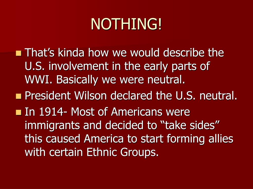NOTHING! • That’s kinda how we would describe the U.S. involvement in the early parts of WWI. Basically we were neutral. • President Wilson declared the U.S. neutral. • In 1914- Most of Americans were immigrants and decided to “take sides” this caused America to start forming allies with certain Ethnic Groups.