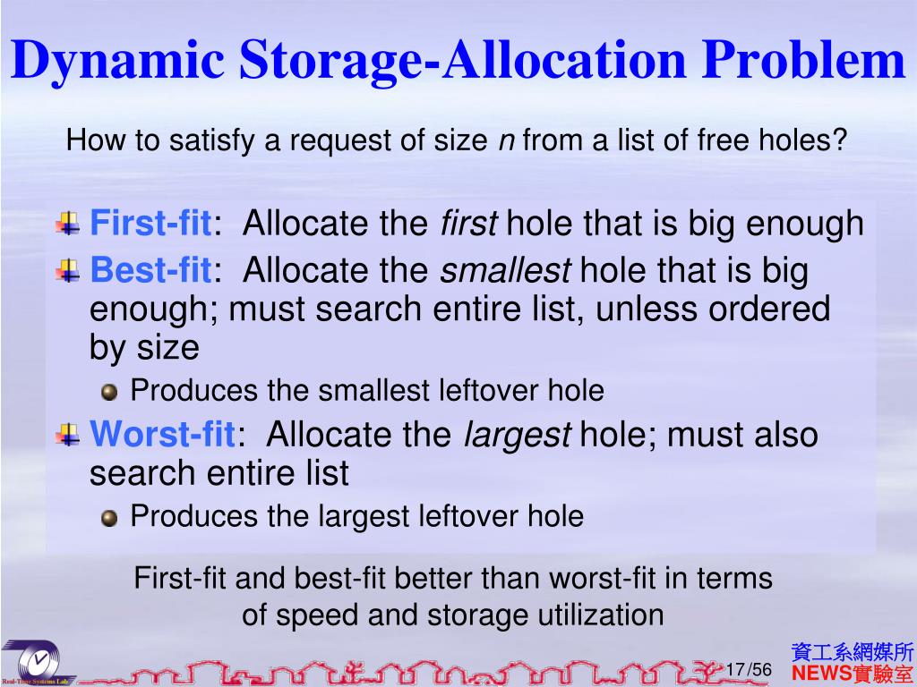 Dynamic Storage-Allocation Problem How to satisfy a request of size n from a list of free holes? • First-fit: Allocate the first hole that is big enough • Best-fit: Allocate the smallest hole that is big enough; must search entire list, unless ordered by size • Produces the smallest leftover hole • Worst-fit: Allocate the largest hole; must also search entire list • Produces the largest leftover hole First-fit and best-fit better than worst-fit in terms of speed and storage utilization /56